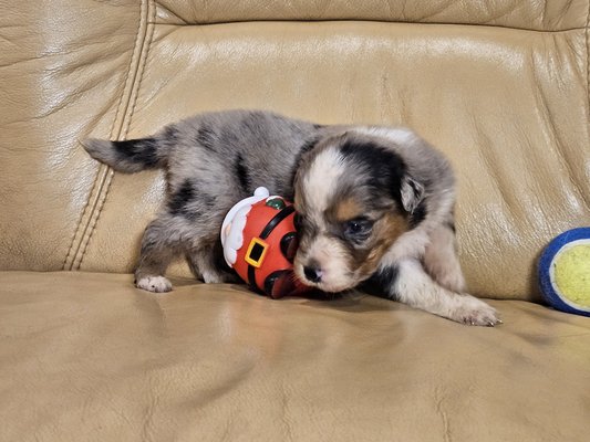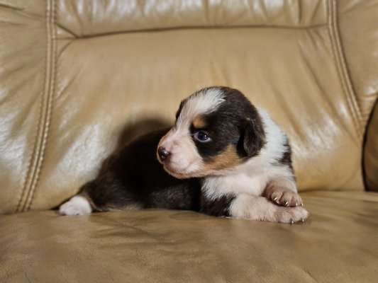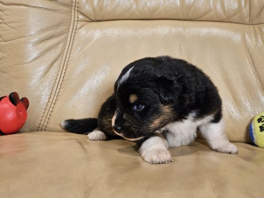 Le papa des chiots est un bleu merle avec pédigrée (LOF) et la maman est une noire tricolore d'origine pédigrée.