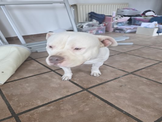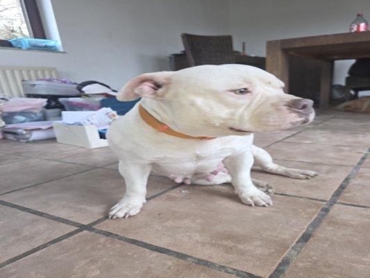 Femelle américain Bully pocket blanche a replacer, super gentille, chien propre, non destructeur, chiens et enfants ok