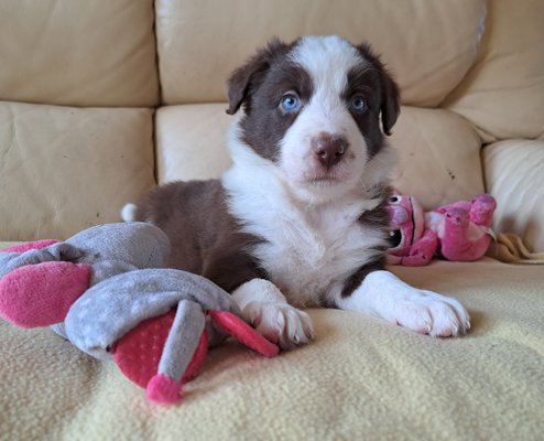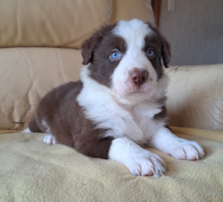 Bonjour, je vous présente le dernier petite mâle border collie chocolat et blanc aux yeux bleu encore à la recherche de sa future famille, Il est né le 1 er novembre et Il pourra nous quitter à partir de ses 8 semaines et en ordre de puce, vaccins, vermifuges, carnet européen, pedigree nvbk, garantie et accompagnés d'un pack de départ royal canin. Les parents sont testés aoc et mdr1 négatifs.