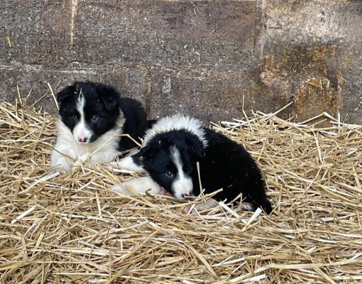 2 petits mâles Border Collie nés sur l'exploitation. Parents visibles et habitués au travail avec les bovins.