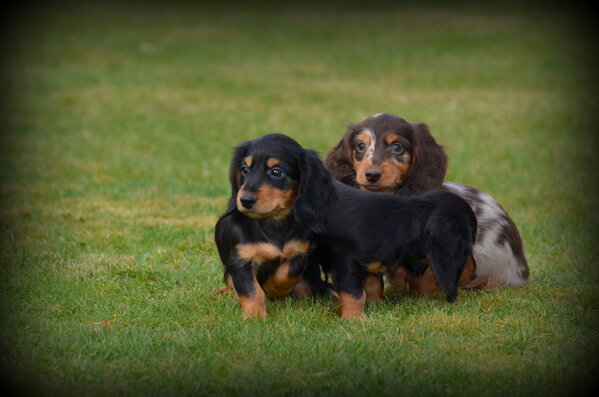 Nous avons de magnifiques chiots Teckel poil long, males, en choco merle et en noir et feu!