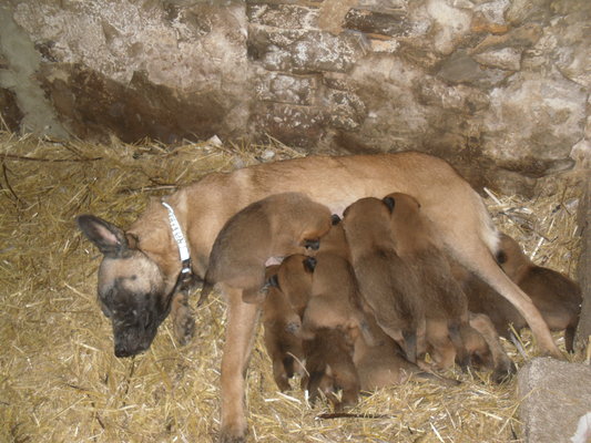 Photos 1: la mère et ses chiots mâles et femelles avec beau masque noir, origine grande taille, disponible le 7 janvier avec pedigree seront vermifugés, pucés, vaccinés (avec passeport) et visiter par un vétérinaire, livrés en bonne santé, élevés dans un milieu naturelle (ferme) et héritiers de gènes de docilités qu' ont les chiens de travail, réservation avec acompte, renseignement tél. no 081/400334