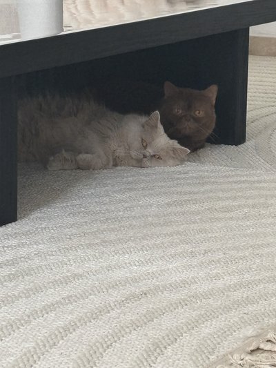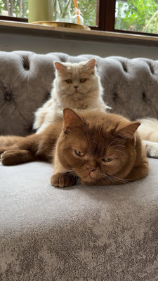 Le mâle British Shorthair Cinnamon est très posé et tendre. Toute sa vie tourne autour de son amour pour elle — il la suit partout, dort à ses côtés et la protège avec une affection touchante.