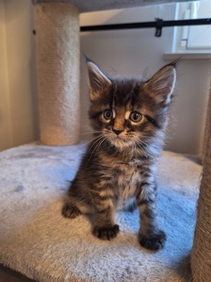 Un adorable chaton Maine Coon né début août et élevé en famille est à réserver. Il fait partie de notre vie au quotidien.