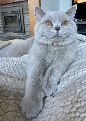 Magnifique mâle British Shorthair lilac, aux yeux dorés intenses, au caractère calme et affectueux, disponible pour saillie.