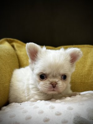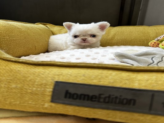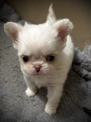 Merveilleux petit Chihuahua blanc crème poils longs.