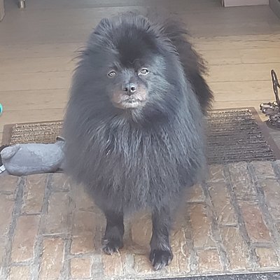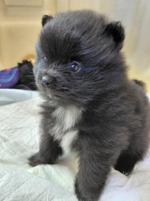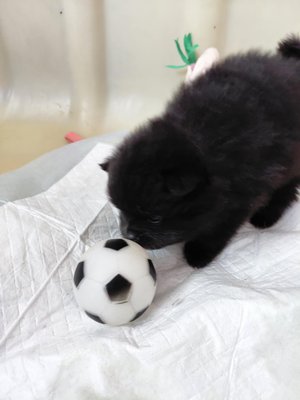 Petite femelle Spitz noire avec une tache blanche. Elle sera vermifugée, pucée et vaccinée avant son départ. Elevage familial, en contact régulier avec les enfants. Les 2 parents sont visibles sur place.