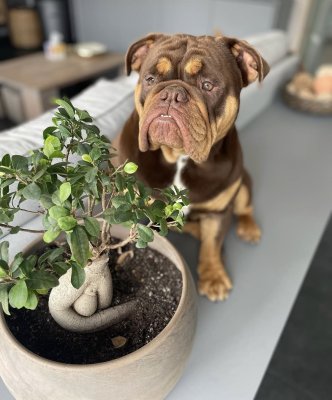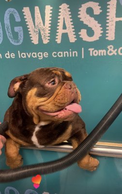Je propose pour saillie mon mâle Gaston, New English Bulldog couleur chocolat tan, bientôt âgé de 4 ans.