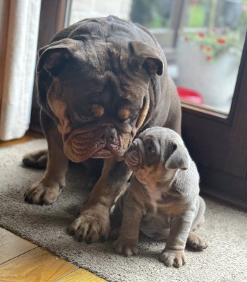 Saillie,New English Bulldog Chocolat Tan, Pedigree.
