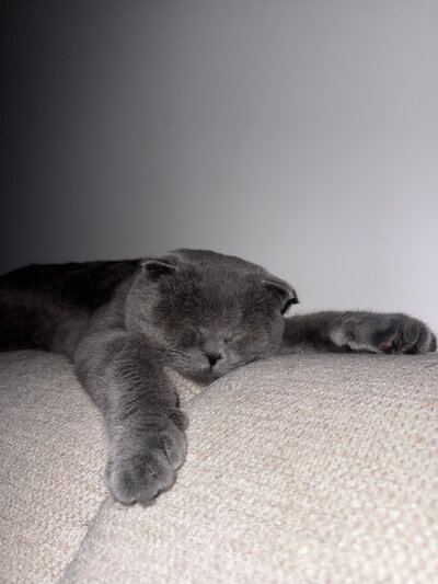 Voici Sanji, magnifique Scottish Fold aux oreilles pliées (oui, le charme irrésistible), âgé de 11 mois. C’est sa toute première saillie, mais monsieur est déjà plein d’élégance et de douceur.