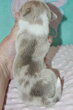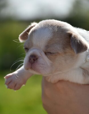 Le papa est chocolat et blanc, il pèse 2 kg, il a le poil long. Il est testé santé clear et il est indemne de luxation des rotules. Il est testé adn, fci (lof,losh)