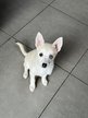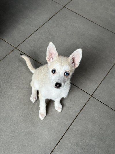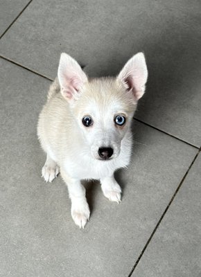 Superbe petit Pomsky blanc aux yeux bleus