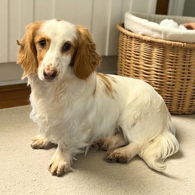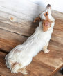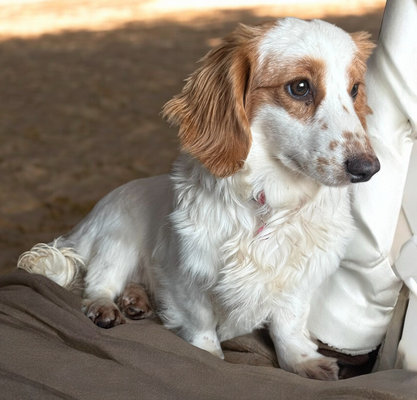 Scotty est un splendide teckel mâle non castré de 2 ans à la robe rare crème piedbald et aux yeux verts.