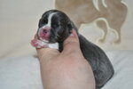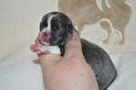 Zigzag est de couleur bleu et blanc poil court, morphologie superbe, petit nez, tête bien pommée, c’est une merveille, porteur chocolat