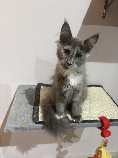 Jolie femelle Maine Coon avec pédigrée, vermifugée, vaccinée, carnet Européen. Si pour compagnie sera stérilisée avant départ. Parents testés pour toutes les maladies génétiques et échographies cardiaques et rénales exécutées par vétérinaire cardiologue. Habituée aux chiens. Connaît déjà très bien son nom très attachante et câline. Partira avec kit de départ.