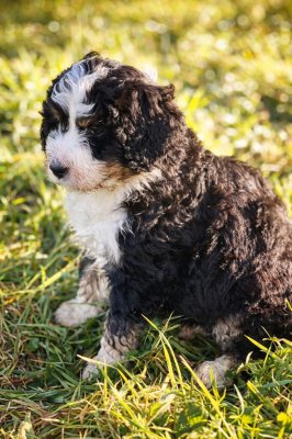 🐾 Le papa est un Bernedoodle F2 (deuxième génération), reconnu pour son intelligence, sa sensibilité et son pelage hérité du caniche, peu sujet à la mue.