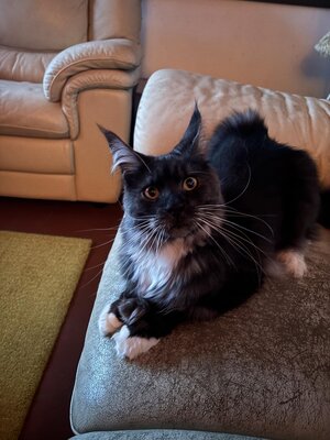 Ulysse est un Maine coon black smoke et White polydactyle. il a son pedigree, s’entend très bien avec les chiens….et autres chats