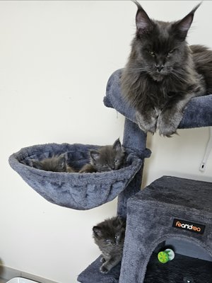 Maine Coon à la recherche d'une nouvelle famille. Il y a 1 femelle adulte (la maman des jeunes ci-dessous) 3 jeunes nés en août de l'année passée que je souhaitais garder. 1.